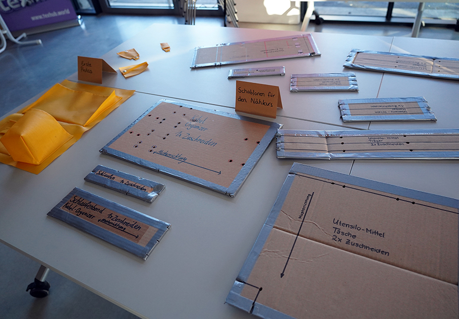 Unter der Leitung von Prof. Sven Gerhards entwickelten die Studierenden zunächst eine breite Palette an Ideen – von der Arbeitsschürze bis zum Sonnenschutz fürs Auto. Die Schwierigkeit: Das Material ist ziemlich starr, und die Produkte mussten so konzipiert sein, dass sie auch für Nähanfänger ohne kompliziertes Zubehör wie Reißverschlüsse umsetzbar sind.