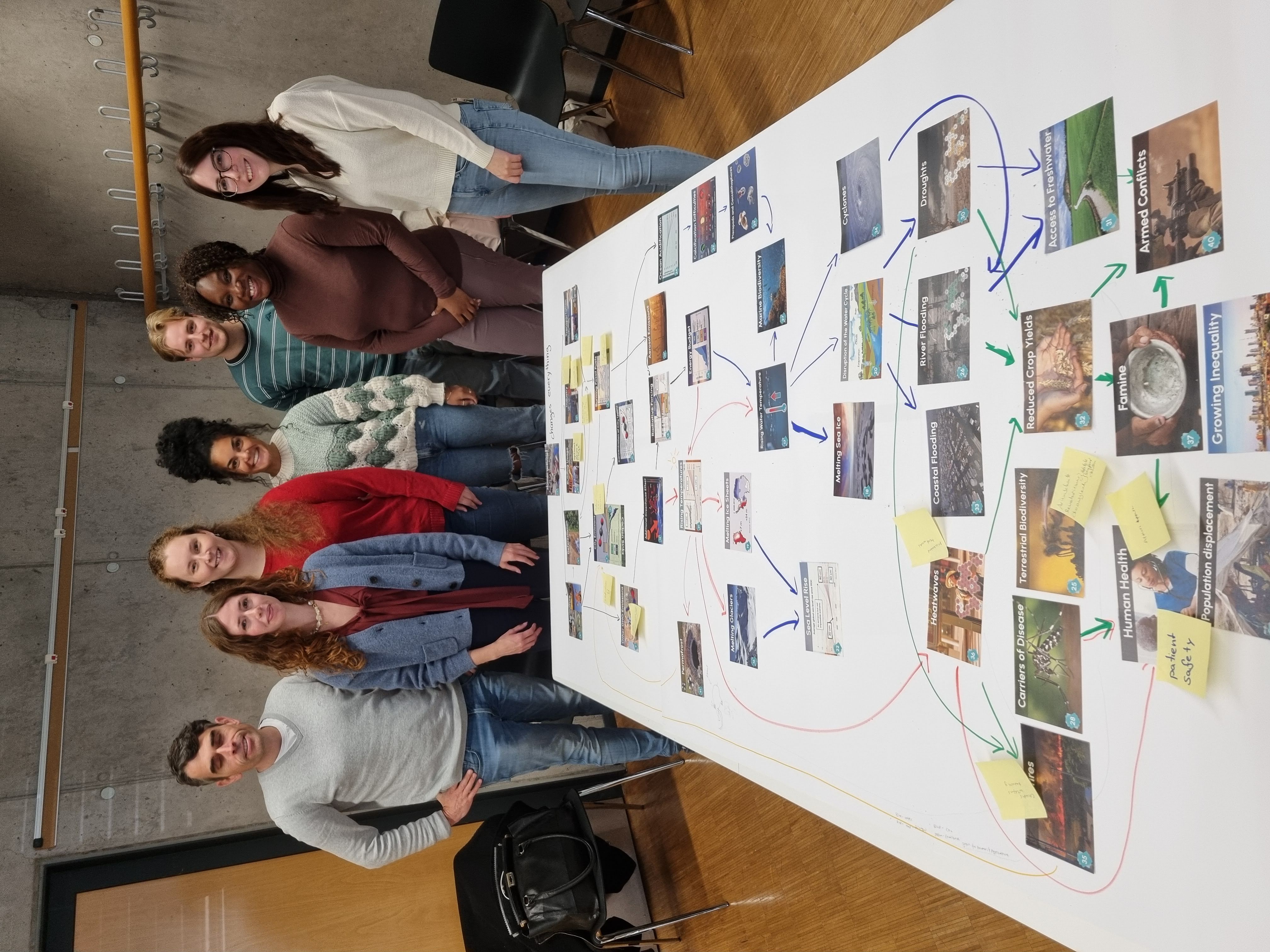 Ein besonderes Highlight war die erstmalige Durchführung des Climate Fresk – eines kollaborativen Lernspiels, das die komplexen Zusammenhänge des Klimawandels eindrucksvoll sichtbar macht. Gemeinsam erarbeiteten die Studierenden, wie Ursachen, Auswirkungen und Rückkopplungen miteinander verknüpft sind – und reflektierten dabei auch den Bezug ihrer eigenen Nachhaltigkeitsprojekte zum Klimawandel.